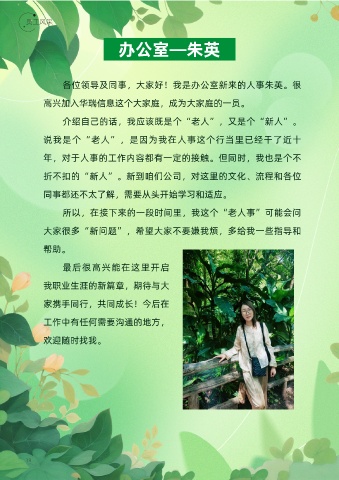 各位領(lǐng)導及同事,大家好!我是辦公室新來(lái)的人事朱英。很