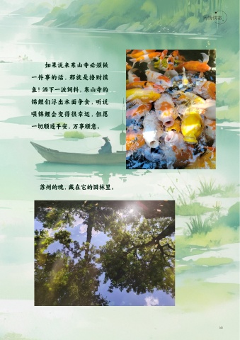 如果說(shuō)來(lái)寒山寺必須做 一件事的話(huà),那就是擼財摸 魚(yú)!灑下一波飼料,寒山寺的 錦鯉們浮出水面爭食,聽(tīng)說(shuō) 喂錦鯉會(huì )變得很幸運,但愿 一切順遂平安,萬(wàn)事順意。 蘇州的魂,藏在它的園林里。 56