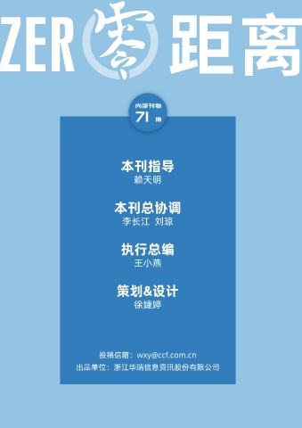 內部刊物 71 期 本刊指導 賴(lài)天明 本刊總協(xié)調 李長(cháng)江 劉瓊 執行總編 王小燕 策劃&設計 徐婕婷 投稿信箱:wxy@ccf.com.cn 出品單位:浙江華瑞信息資訊股份有限公司